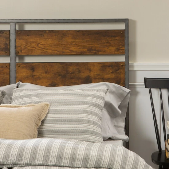 Rustic simplicity and industrial ingenuity combine beautifully in this plank style bed. Constructed of high-grade MDF, laminate and powder-coated metal, this versatile and stylish bed frame features an open panel design and large horizontal planks with nailhead details. This bed is sure to be a favorite in your rustic or industrial style home.