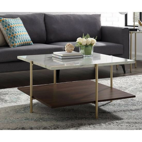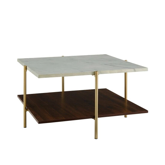 Make a statement in your living room with this 32-inch square coffee table. A brilliant combination of style and function, this table boasts a faux marble laminate top, one lower laminate shelf and metal legs for an altogether elegant, sleek and stunning piece. Paired with your modern upholstery, this table is certain to wow family, friends and guests.ย