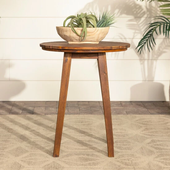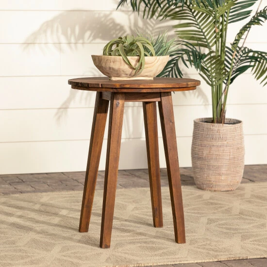 Bring home this 20-inch round outdoor side table from Middlebrook Designs for a unique and stylish addition to your patio or deck this spring. Constructed from solid acacia wood and featuring a beautiful stained finish, this table is weather resistant and features a slat table top. Ideal next to your outdoor sofa or sectional, this table is perfect for a few icy drinks and snacks as you relax and soak up the sun.
