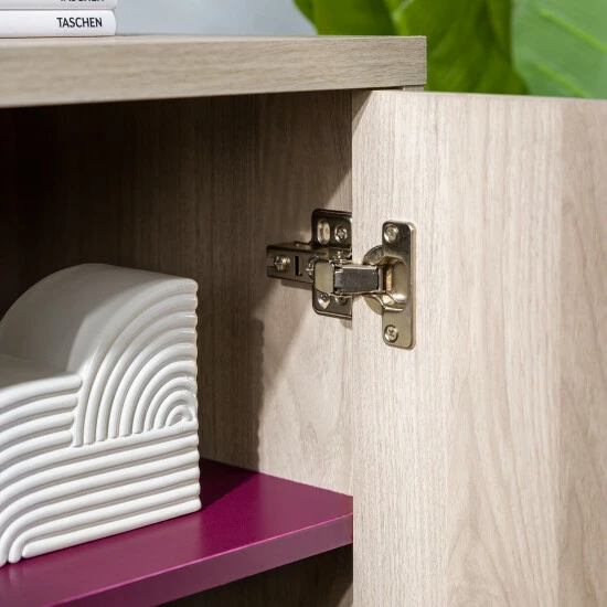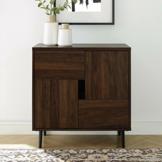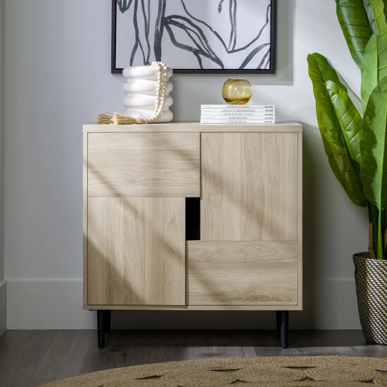 This charming accent cabinet will give your space a chic, modern flair. Two doors open to reveal four interior storage cubbies, perfect for a wide variety of media supplies, dishes, and more. This cabinet’s size also makes it a great choice for a TV stand.