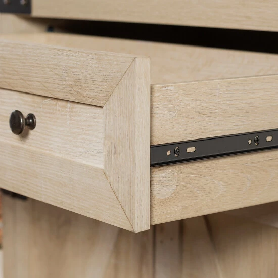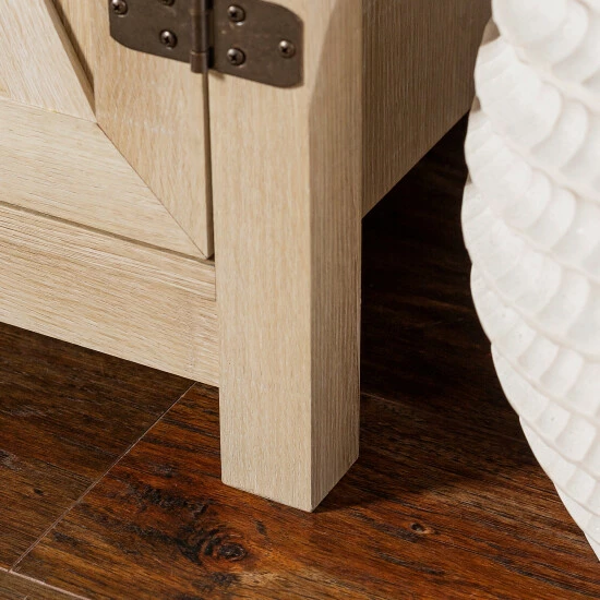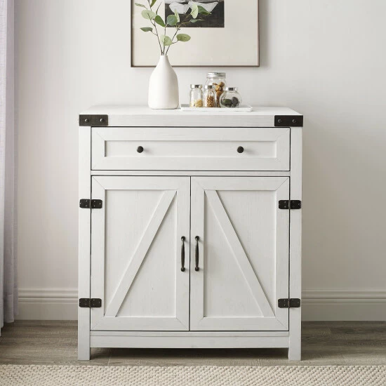 Incorporate this unique barn door accent cabinet into your living room, dining room, or kitchen for a little extra storage space. ย Featuring a drawer and shelves behind two barn-style doors, you’ll be pleased to have plenty of storage space. Constructed of high-grade MDF and laminate, this cabinet is the perfect addition to your modern farmhouse.