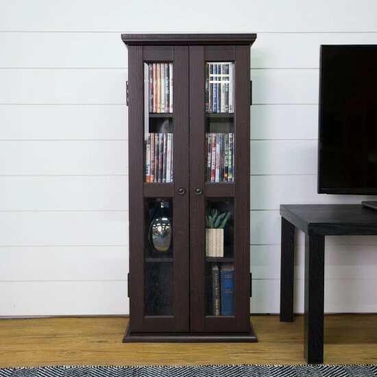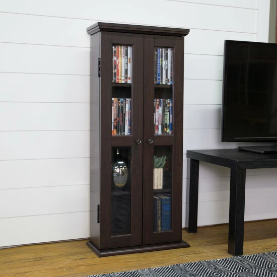 Preserve your media collection with this tall media storage cabinet by Middlebrook Designs. With a beautiful espresso finish, this cabinet meshes easily with various decor styles. Three shelves create multiple roomy compartments to make space for books and memorabilia, and the glass panes on the double doors keep everything within sight.