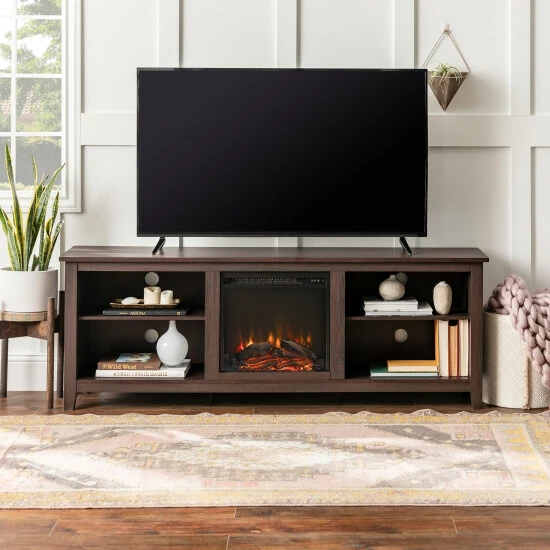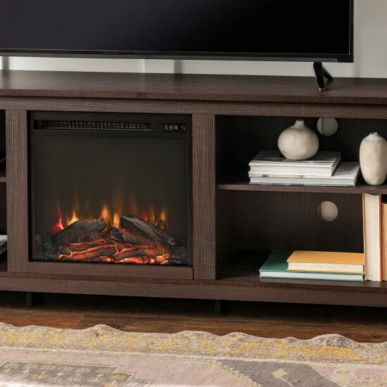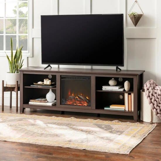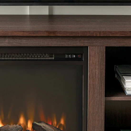 Create a cozy and inviting space to watch your favorite TV episodes and movies with this 70-inch Fireplace TV Stand Console. Crafted from high-grade MDF and laminate, this media console features a faux reclaimed wood finish and will accommodate most flat panel TVs up to 80 inches. Two adjustable shelves provide ample space for your media components and accessories and four cable management openings in the back panel will help keep wires shipshape and organized. The 18-inch electric fireplace insert simply requires plugging in and switching on to heat your living room or great room up to 400 square feet.