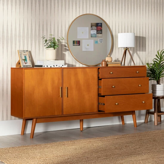 This server will house all of your extra dishes, stemware, flatware and linens between three drawers and adjustable shelving behind cabinet doors. This console features two doors with soft close hinges and two adjustable shelves behind the cabinet. Crafted from high-grade MDF and solid wood veneer with a beautiful, warm finish, this versatile buffet cabinet can effortlessly transition to any room.