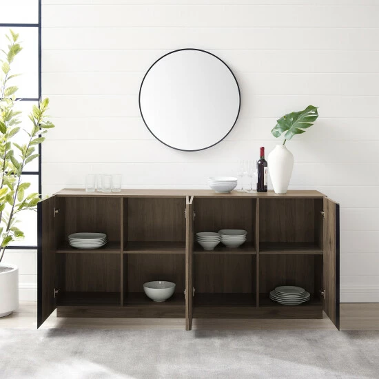 Ultra-sleek and sans hardware, this contemporary sideboard is the epitome of “less is more.” The clean, crisp silhouette with modern, black metal accents will make a bold statement in your kitchen or dining room. Featuring four adjustable shelves behind soft-close doors, this piece will provide ample storage space for your entertaining essentials, linens, flatware and more. Built-in cable management openings on the back panel and wall-anchor hardware complete this versatile and sophisticated cabinet.