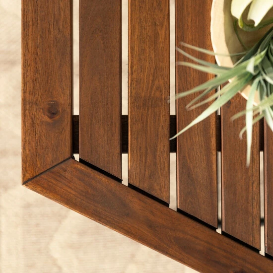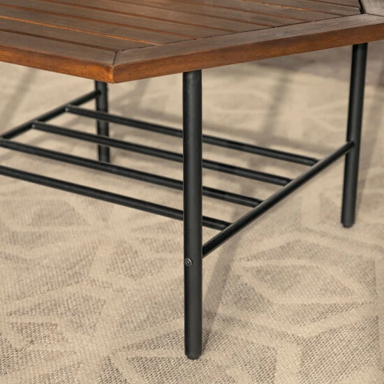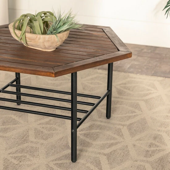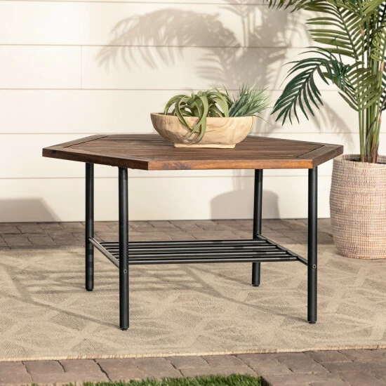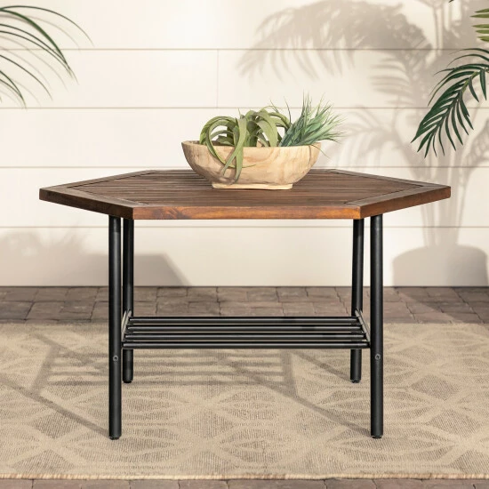 Bring home this hexagon outdoor coffee table from Havenside Home for a unique and stylish addition to your patio or deck. Constructed from responsibly harvested acacia wood and powder coated steel, this table is weather resistant and features a hexagon shape slat table top in a beautiful dark brown finish. Pair with the matching love seat or chairs and a few icy drinks for a lovely summer evening outside.