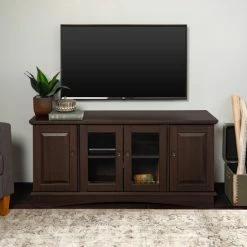Showcase your flat panel TV atop this classic 52-inch TV stand console from Middlebrook Designs. ย Constructed of high-grade MDF with a laminate finish, this console is designed to support most flat panel TVs up to 58 inches. ย With one adjustable shelf behind two framed glass doors and two cable management openings on the back panel, you’ll have plenty of room for all of your media consoles. ย Two side doors conceal additional shelving to house your movies, games and more.ย