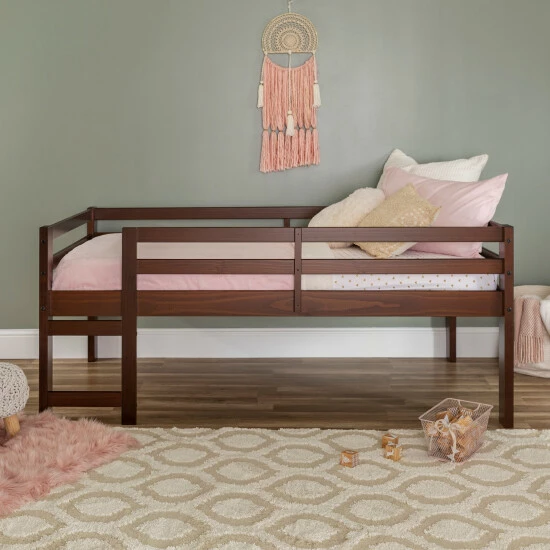 This whimsical, charming, and unique, low loft bed is designed to make the bunk accessible to small children with a short ladder as well as provide an area for play or storage underneath. Guardrails surround the top bunk to ensure safety for your child, while support slats are included to support a Twin-size mattress, so that no box spring is needed.