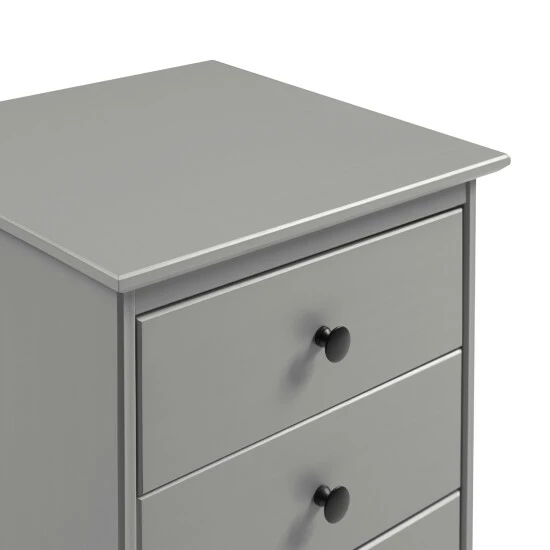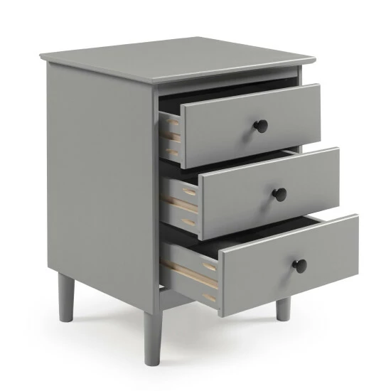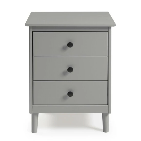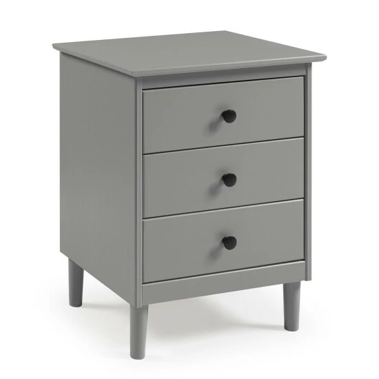 This remarkably throwback yet mid-century modern three-drawer wood nightstand is the answer to your bedside needs. Crafted from solid pine and manufactured wood and topped off with a painted finish rooted in traditional style, this nightstand showcases centered knobs on each drawer, stained for a long-lasting finish, and short, tapered legs at its base.