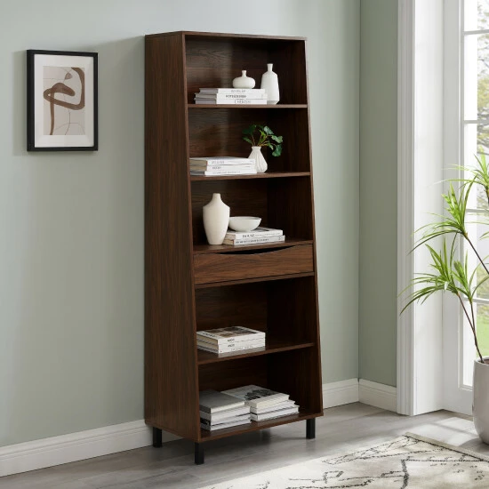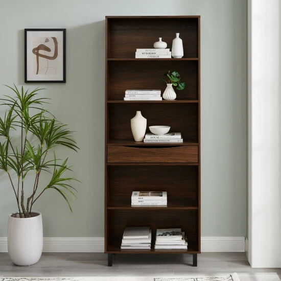 Not just any bookshelf, this piece features a smooth-glide drawer, adjustable shelf, and wall-mounting hardware so your décor can rest both stylish and stable. Three fixed shelves make the perfect perch for houseplants, interior design books, or your growing record collection. Or, you can host your office essentials and work-from-home necessities atop sturdy shelving that features three cord management ports where you can organize cables and cords. Wherever you place this piece, its modern silhouette will add an instant upgrade and modern functionality to any space.