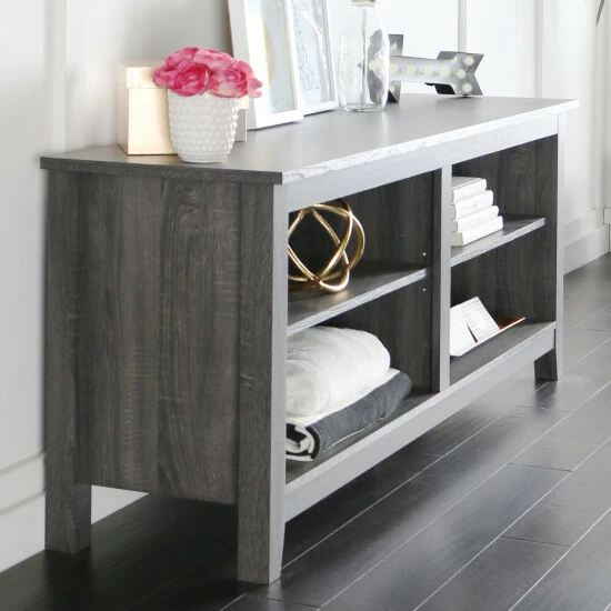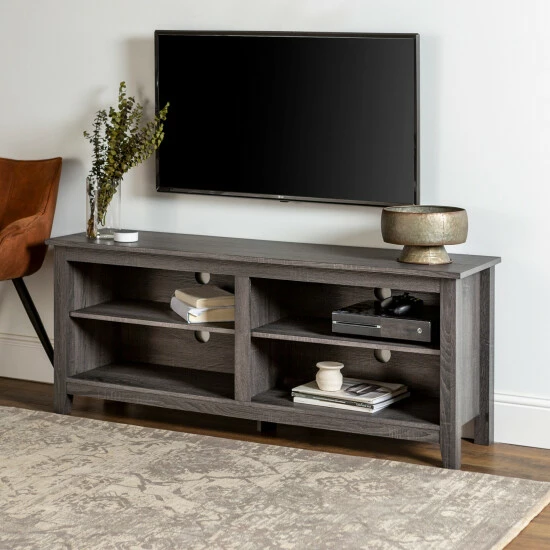 Kick up your feet, relax on the sofa and binge-watch your favorite films and TV episodes in front of this 58-inch TV console from Porch & Den. Crafted of high-grade MDF and durable laminate, this TV stand includes 2 adjustable shelves providing ample, open shelving to house all of your media components and keep every cable and wire concealed through pre-drilled wire management openings on the back panel. So whether your home is traditional, rustic or the perfect modern farmhouse, our 58-inch console will be the perfect addition to your great room and will accommodate most flat panel TVs up to 65 inches.
