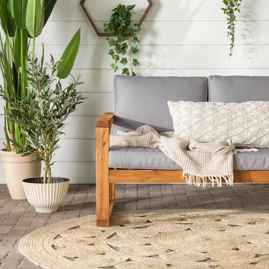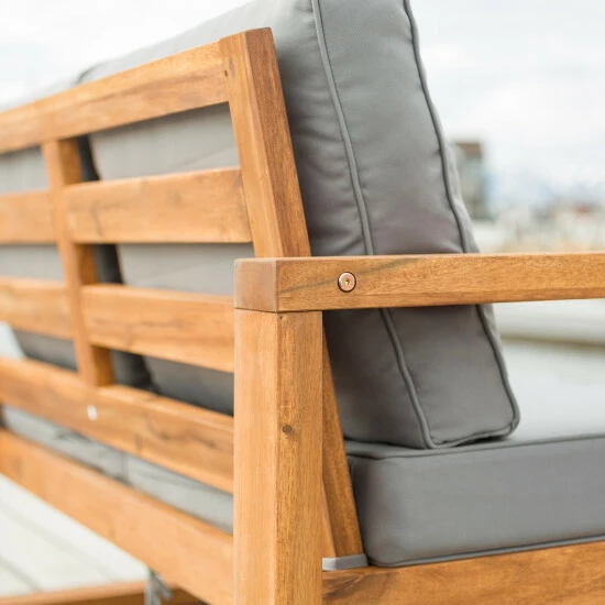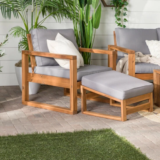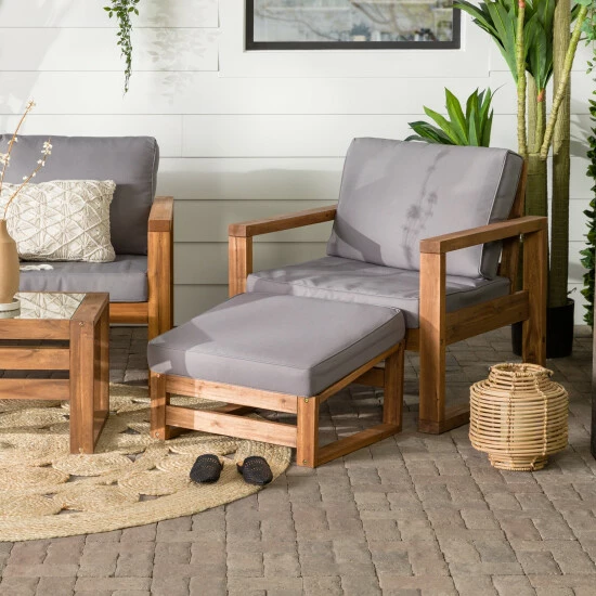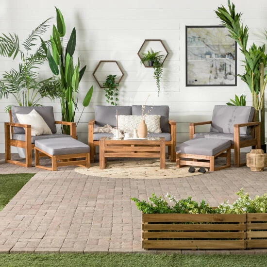 Relax outside on your patio or deck in comfort and style in this outdoor chat set from Middlebrook Designs. ย Plush, grey upholstered, weather resistant seat cushions, solid acacia wood and tempered glass are brought together to create the perfect outdoor set you and your family will love season after season. ย This deluxe group includes one love seat, two chairs, two angled ottomans and one coffee table. ย So grab your ice cold drinks and snacks, prop your feet up and enjoy the warm weather and conversations.ย