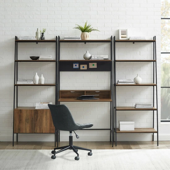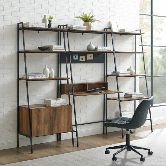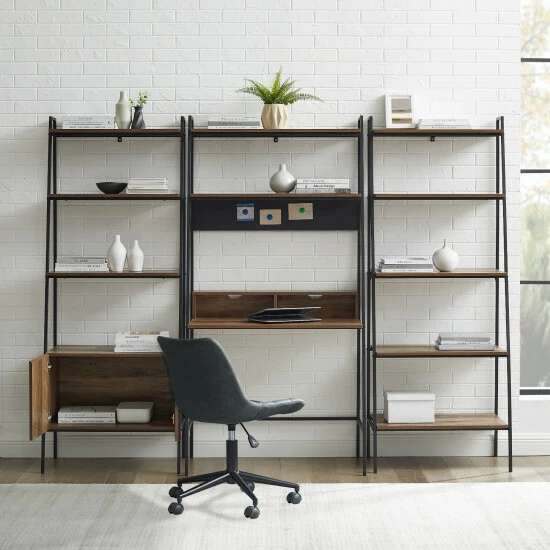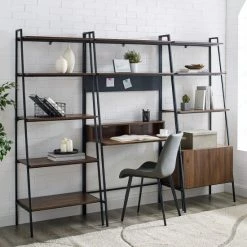 Give your great room or home office a sleek upgrade and bring home the Lahuri desk, ladder storage cabinet and bookshelf set from Middlebrook Designs. ย Constructed of high-grade MDF and wood grain laminate supported by an angled metal frame, the unique desk provides a compact work surface, two open cubbies for storage and two shelves above. ย The ladder storage cabinet includes three shelves and a lower two-door storage cabinet and the ladder bookshelf includes five open shelves. ย Easily keep your home office books and files at your fingertips in the ample storage space. Your home office will be functional and stylishly organized in no time.