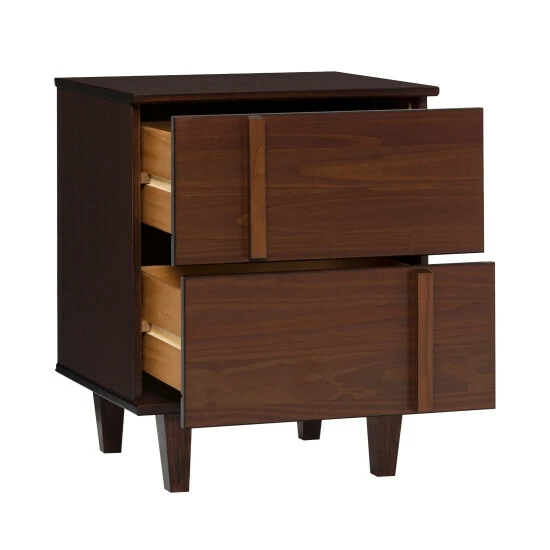 Sleek, vertical drawer pulls, spacious storage, and a solid wood build lend this piece all the components of a modern knockout. This unique bedside table will pull your space together with its mid-century design, and the two spacious drawers on smooth wood runners will keep your space clutter free. With its minimal build, this nightstand is suited for any interior style, and whether it sits in your own sanctuary, guest room, or child’s bedroom. With a sturdy solid pine build, this side table will serve up years of sustainably stylish storage for years.