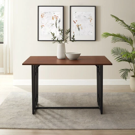 Serve up your family’s favorite dish, debut-worthy dรฉcor, or a stylish vanity display atop the chic surface of this ultra-versatile dining table. With swiveling yet sturdy metal legs and drop-leaf sides, this table can be anything you want it to be, from an entry table to office desk. A table perfect for small spaces and sprawling spaces alike, you can seat up to eight friends and family around the tabletop for dinner and game night, then drop each of the sides for a smaller display. With its unique, contemporary frame and stunning veneer woodgrain, wherever you choose to display this piece will be effortlessly upgraded.