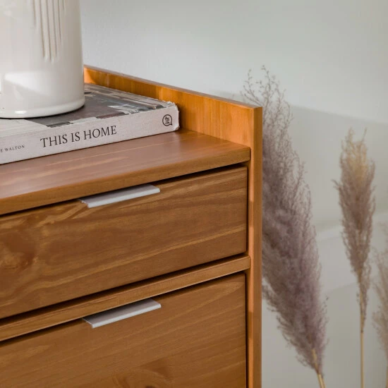 Whether your interiors are Scandinavian, modern, or mid-century-inspired, this six-drawer chest is sure to make a stylish debut in your sanctuary. Constructed with responsibly harvested solid pine wood, this storage chest features six drawers on wood runners and sleek metal drawer pulls. The gallery top is the ideal space to display cosmetics, cologne, jewelry and treasured essentials. Classic functionality and stylish sustainability can be yours when you click add to cart.