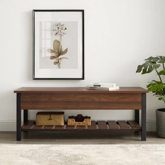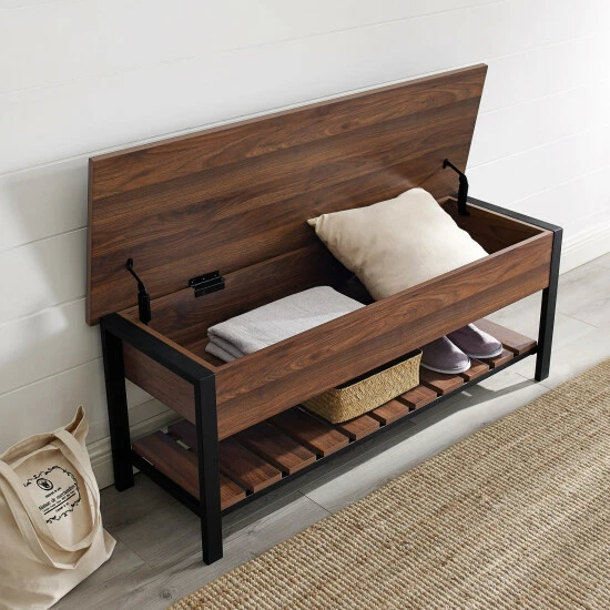 This storage bench is the perfect addition to your entryway. The slatted open shelf at the bottom is perfect for storing shoes, letting you sit down while you put them on or take them off. The top lifts up to reveal an extra storage compartment for hidden storage of mittens, scarves, or anything else.
