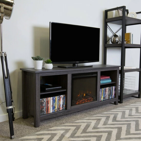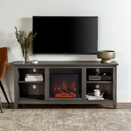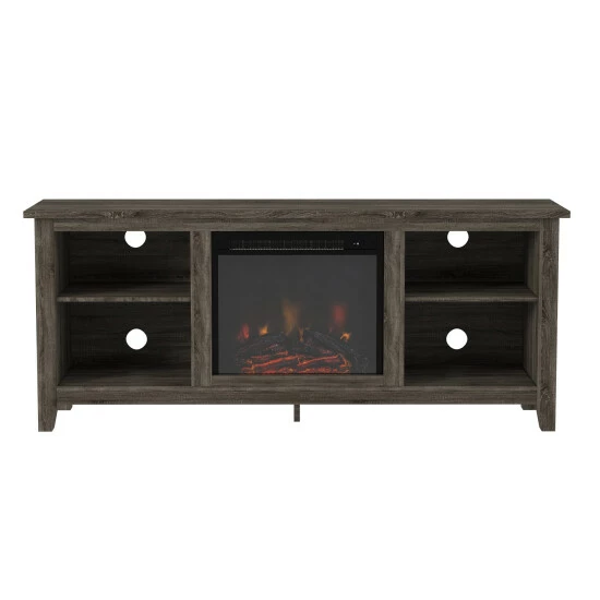 Create a cozy and inviting space to watch your favorite TV episodes and movies with this 58-inch Fireplace TV Stand Console from Middlebrook Designs. ย Crafted from high-grade MDF and laminate, this media console features a faux reclaimed wood finish and will accommodate most flat panel TVs up to 65 inches. ย Two adjustable shelves provide ample space for your media components and accessories and four cable management openings in the back panel will help keep wires shipshape and organized. ย The 18-inch electric fireplace insert simply requires plugging in and switching on to heat your living room or great room up to 400 square feet. ย