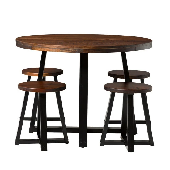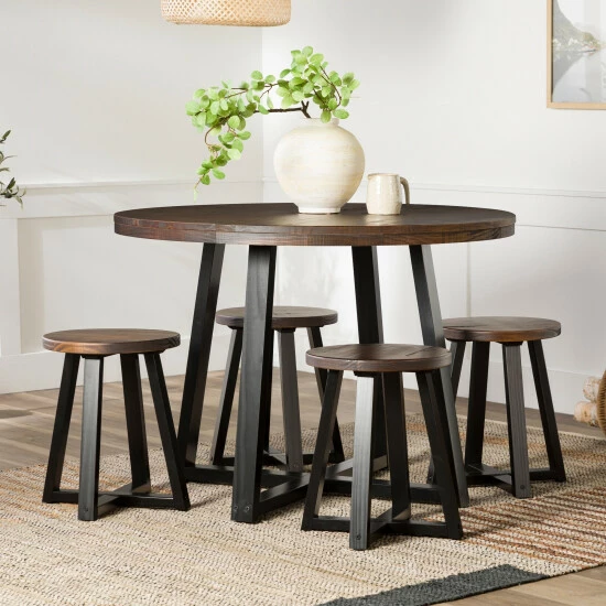 Leave outdated dining sets in the dust with this trendy yet timeless five-piece set that balances modern convenience and rustic style perfectly. Seat friends and family in comfort around the tastefully-distressed, circular table atop comfortable dining stools that’ll look great whether you’re enjoying each other’s company or admiring the set from afar. With a sustainable, solid pine wood frame and sturdy build, this table will host your favorite dinner guests, dishes, and dรฉcor for as long as you’d like it to.