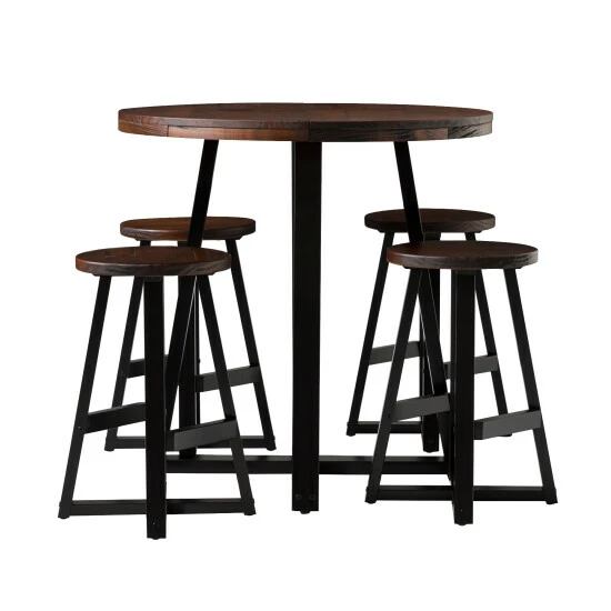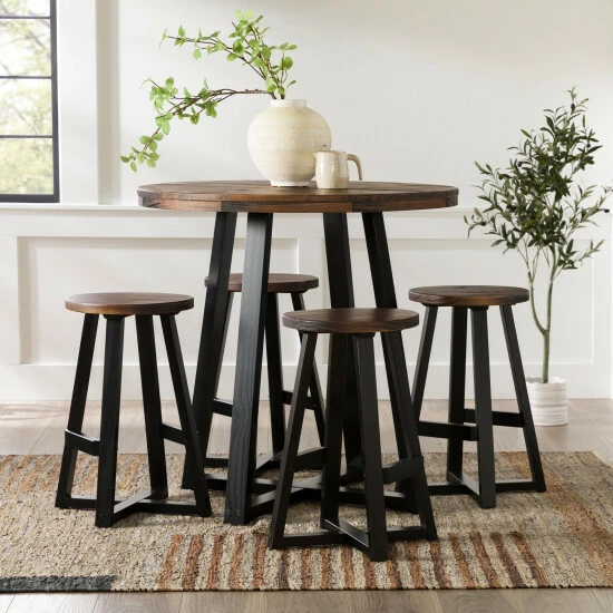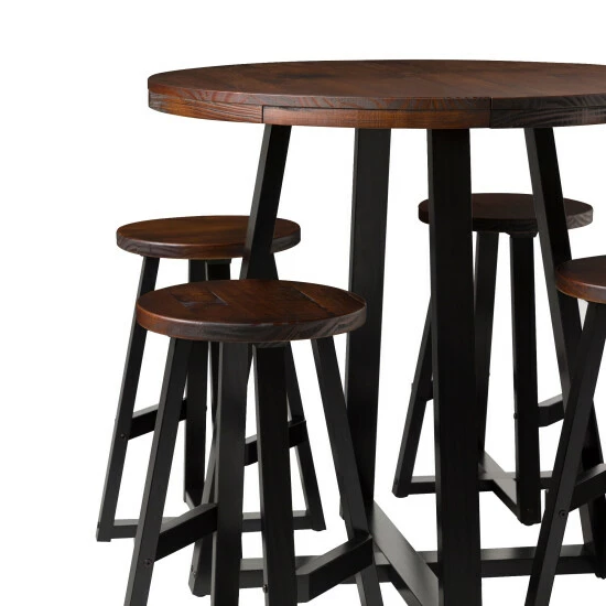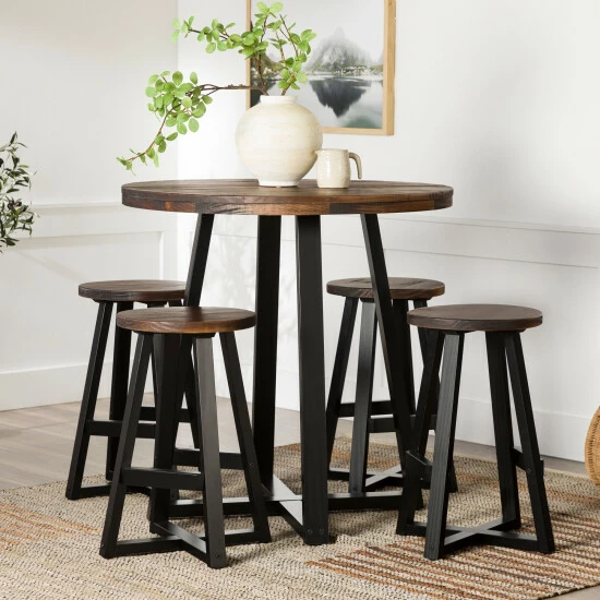 Leave outdated dining sets in the dust with this trendy yet timeless, counter-height five-piece set that balances modern convenience and rustic style perfectly. Seat friends and family in comfort around the tastefully-distressed, circular table atop comfortable counter stools that’ll look great whether you’re enjoying each other’s company or admiring the set from afar. With a sustainable, solid pine wood frame and sturdy build, this table and chair set will host your favorite dinner guests, dishes, and dรฉcor for as long as you’d like it to.