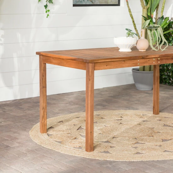 Get set to host outdoor meals and barbecues seated around this 60-inch acacia wood outdoor dining table. A beautiful slat table top features a 2-inch umbrella hole in the center. Easily and effortlessly seat up to six or pull the chairs away for an endless summer buffet. This table is sure to become a favorite on your patio this year!