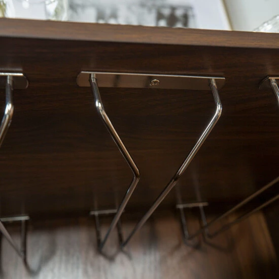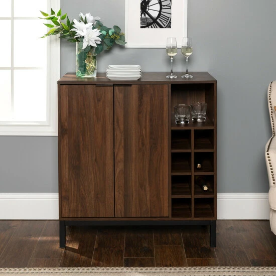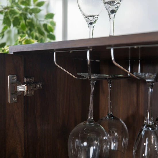 Unique in size and design, this 34-inch bar cabinet is ideal for small space entertaining. ย Constructed of high-grade MDF, laminate and metal, the body of this cabinet is sleek and sits atop a metal base and four metal legs. ย Featuring one fixed shelf and three stemware racks behind two cabinet doors on the left and open shelving and bottle storage on the right, this cabinet provides ample storage for glasses, mixing supplies, bottles and linens while the top is perfect to pour and serve from. A stylish modern design, and available in two finishes, this cabinet is sure to complement your modern kitchen or living room and make entertaining effortless and delightful.