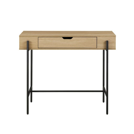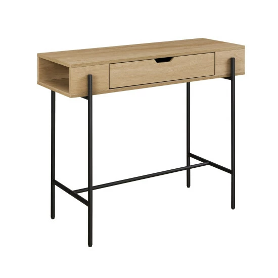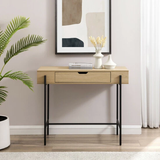 If you love a modern minimalist moment, look no further than this sleek entry table. Hidden cubbies and a single drawer on smooth, telescoping glides make this storage-savvy style statement even more versatile. Keep keys, last-minute touch-up supplies, or random gadgets in the single drawer for an easy out-the-door routine by the entryway. Or, keep it in your home office to display your favorite dรฉcor and conceal clutter. Wherever it is, this entry console is fit to function as a simple yet stylish statement piece, as well as a place to provide a space for any and everything.