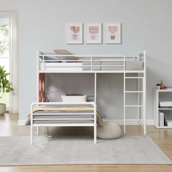 Allow your littles to express their creative side with this the colorful cutouts and unique, L-shaped silhouette of this twin bed. An ultra-sturdy metal frame accented by durable, ultra-smooth gloss colored paint means this bed is made to last, whether it’s situated in your kid’s hideaway, guest room, or rental space. Its interesting L shape lends a unique twist on the classic bunk bed situation with a perpendicular orientation that’s sure to make a bold statement in any sanctuary.