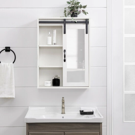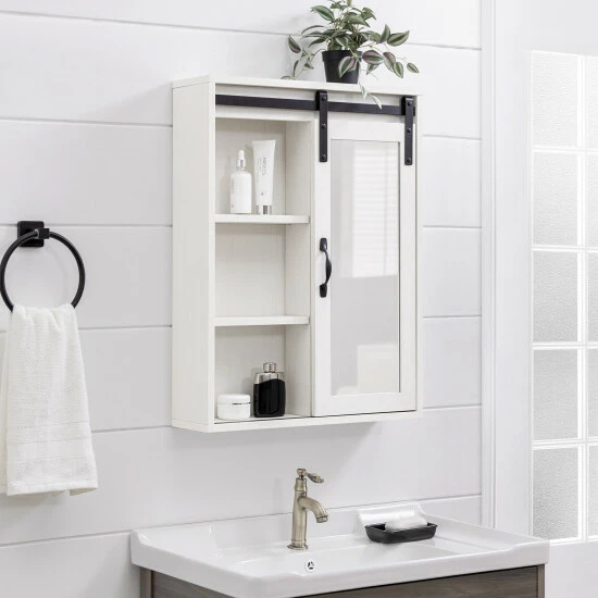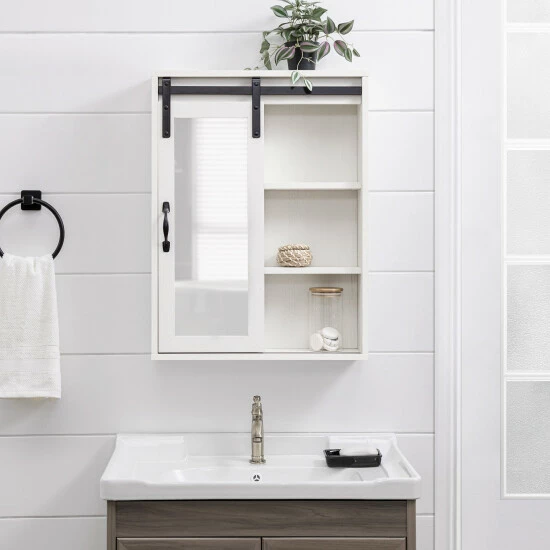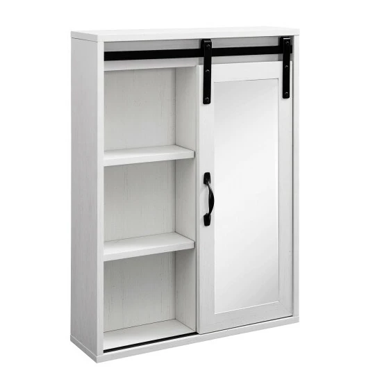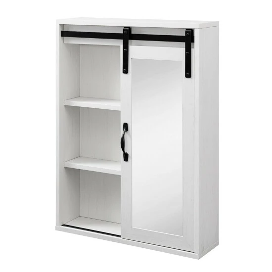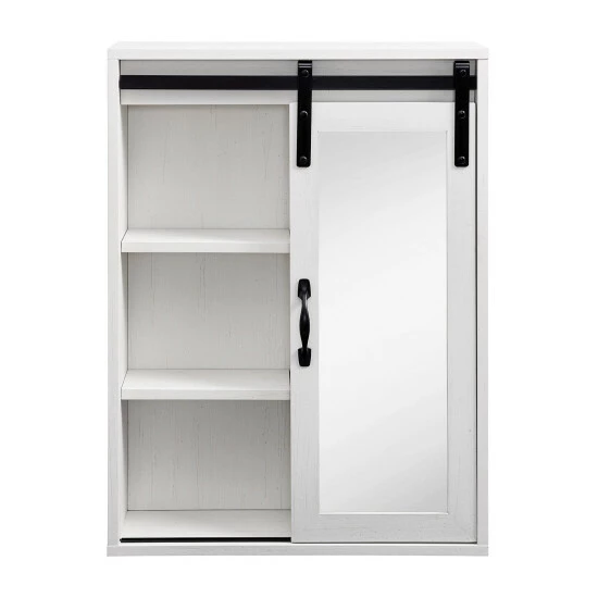 Reflect on your cozy, farmhouse style with this vanity mirror cabinet from Middlebrook Designs. ย A wonderful combination of open and concealed storage, this wall cabinet is ideal to store all bathroom or powder room essentials. ย A framed mirror on a sliding barn-style door will enable you to get ready for your work day or weekend night out. ย A versatile piece, this cabinet will be equally stylish and functional above a dresser in a bedroom or a bench in a mudroom. ย Exposed metal hardware adds the finishing touch to this piece which is destined to become a favorite in your home.